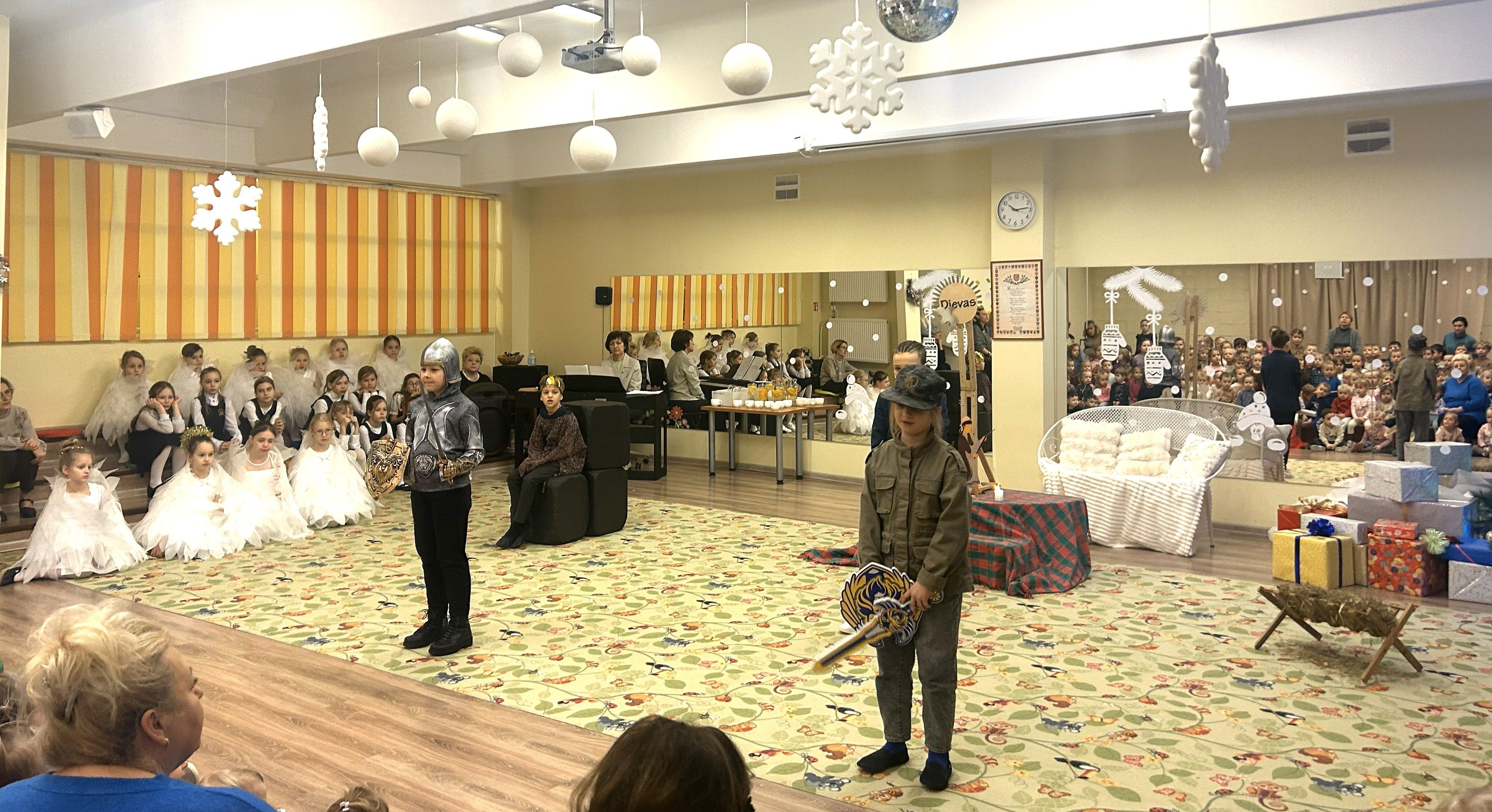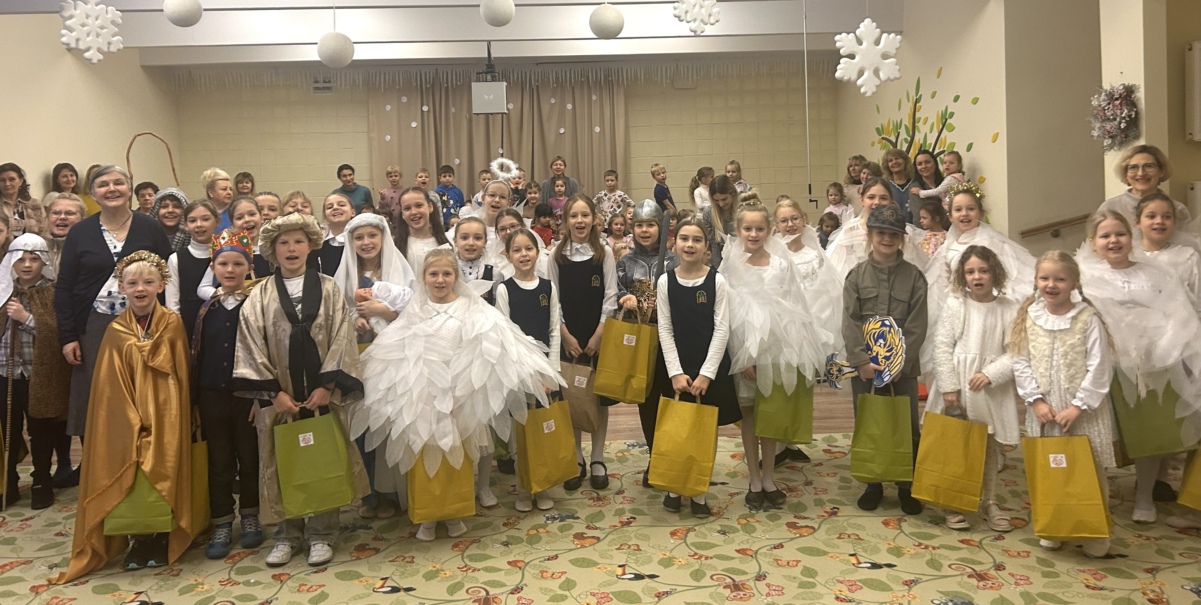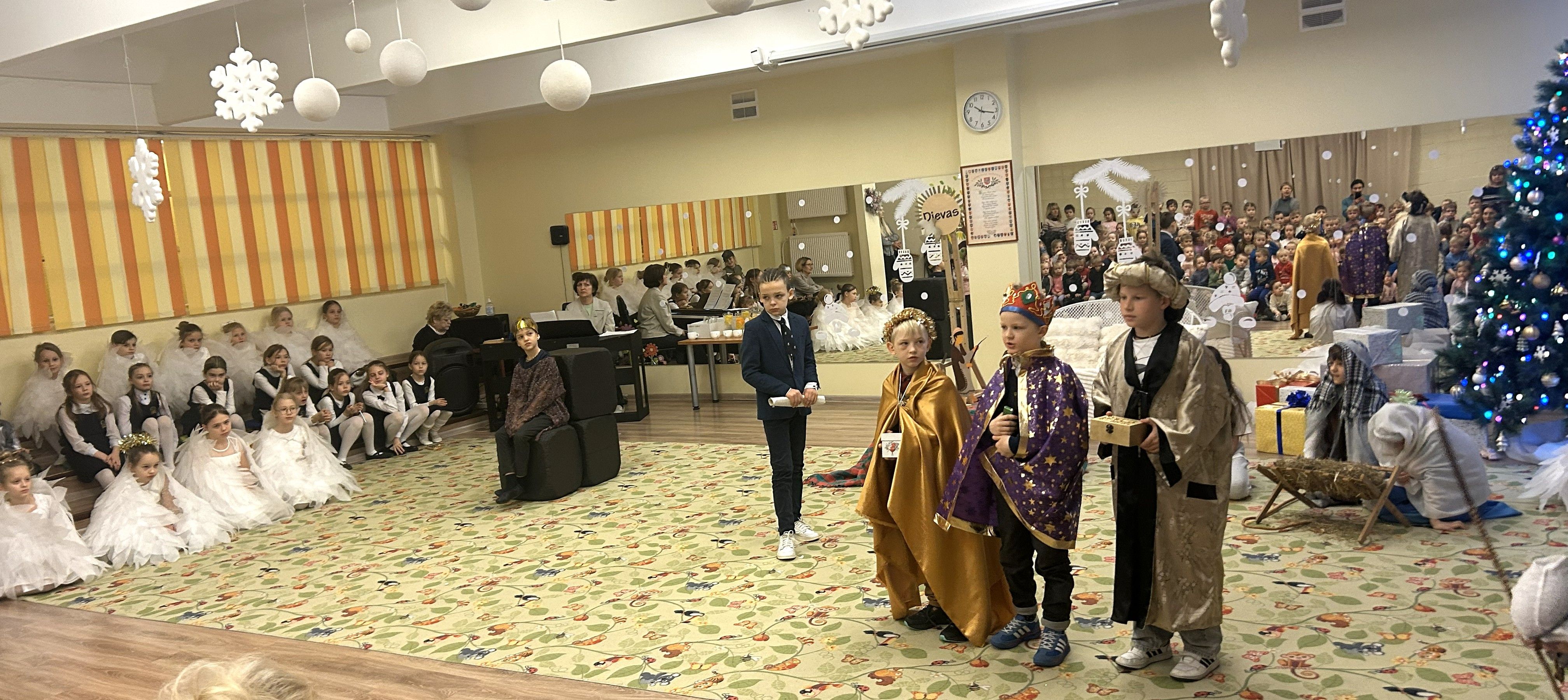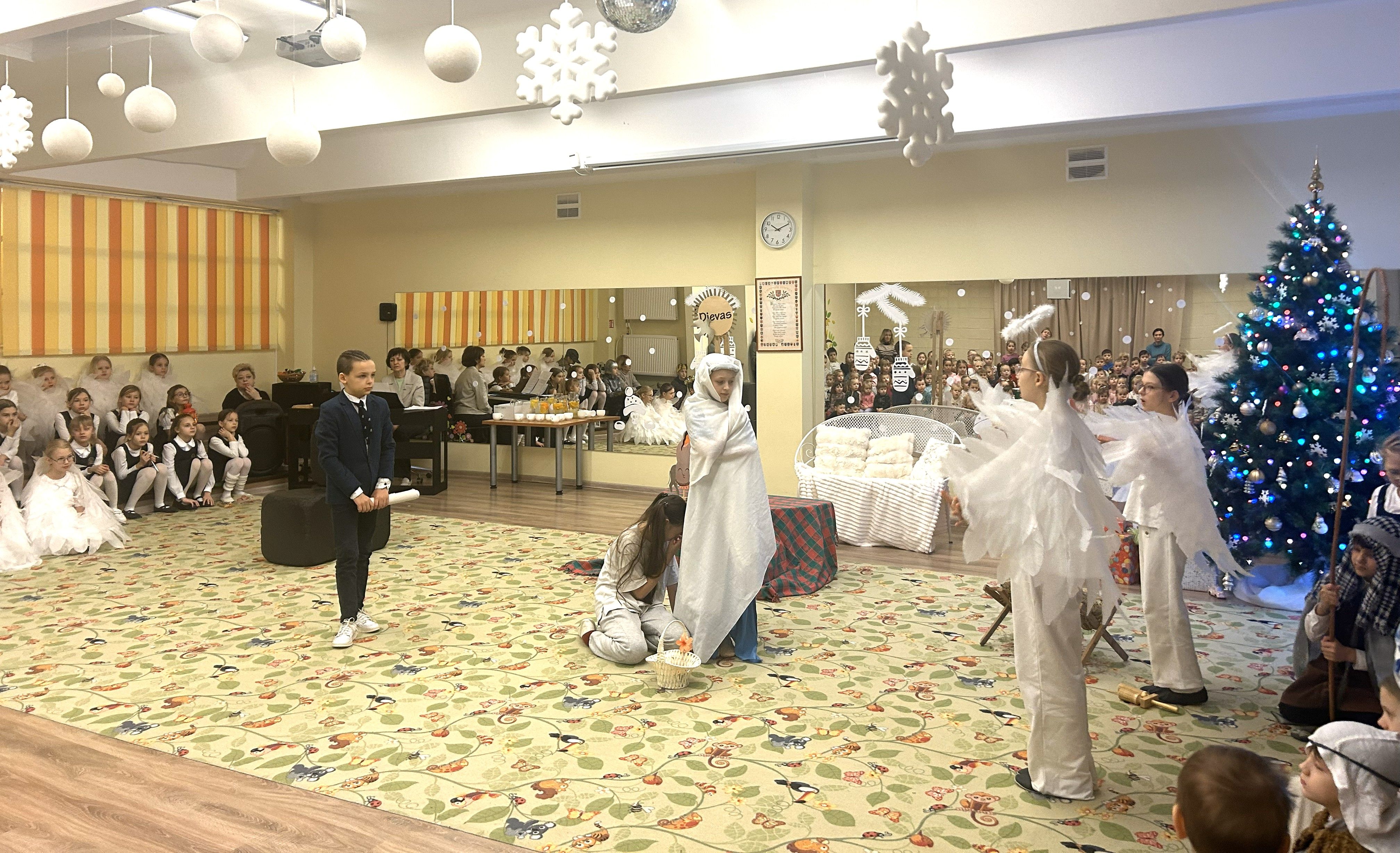 Spektaklį dovanojo Vilniaus Medeinos pradinės mokyklos 1–4 klasių mokiniai, kurie nuoširdžia vaidyba, šokiu ir muzika sukūrė ypatingą pakilią nuotaiką. Angelų šokiai, gyva muzika ir vaikiškas atvirumas pripildė salę ramybės, šilumos ir tikros Kalėdų dvasios.
